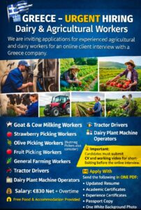 We are inviting applications for experienced agricultural and dairy workers for an online client interview with a Greece company.